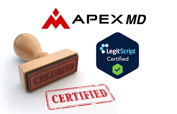 Apex MD has been certified by one of the highest accredited medical auditing companies in the world, Legit Script. Apex MD network of medical providers, pharmacies, products and operations have been thoroughly vetted by Legit Script to be of the highest caliber and in compliance at the highest levels.